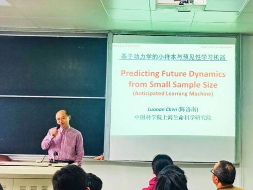 报告开始后,为了让老师同学们更好地理解课题组的研究,陈洛南教授深入浅出地介绍了动力学小样本与预见性学习机器:目前数据分析包括生物信息学等领域主要通过已有样本对数据的变化趋势进行预测,如何利用临床医学、生命科学等学科领域有限的小样本进行预测是亟待解决的科学难题。陈教授课题组创新研发的基于非线性动力学的全新随机嵌入理论和方法(随机嵌入分布方法RDE: Randomly Distributed Embedding)有望解决这一难题。