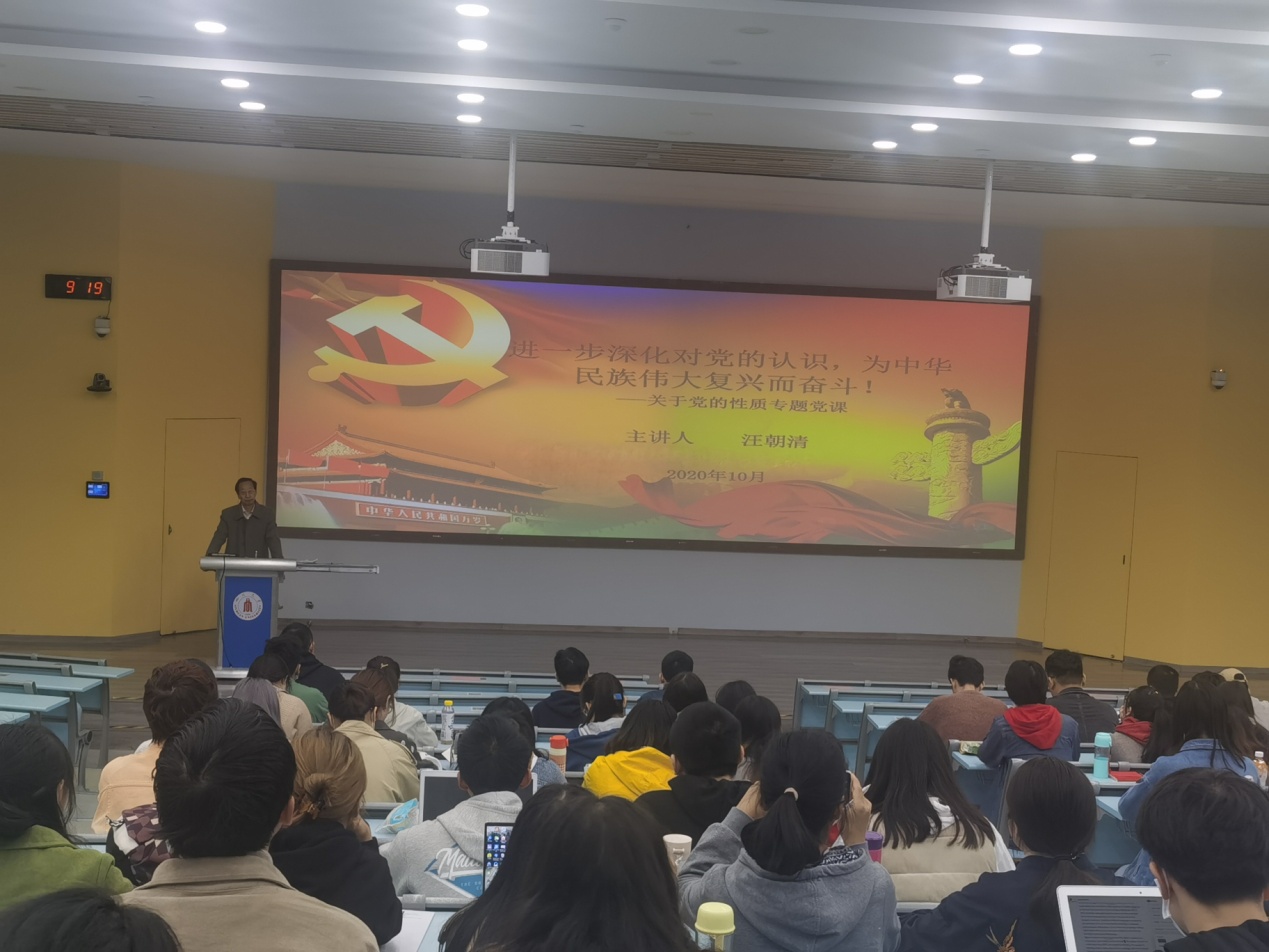 党校第一课由汪朝清教授讲授。汪教授以“进一步深化对党的认识,为中华民族伟大复兴而奋斗”为主题,从“党的性质”的发展历程、“党的性质”的具体分析以及对党的性质的正确认识三个部分展开。在授课过程中,汪教授用浅显易懂的语言对“新时代如何坚持党的性质,为党的事业奋斗”进行层层剖析,使同学们对中国共产党的性质有了更为准确深刻的了解并明确了努力方向。