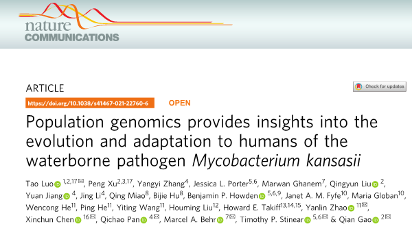 近日,我院罗涛副研究员联合复旦大学高谦教授团队及国内外多家机构在Nature Communications在线发表了题为“Population genomics provides insights into the evolution and adaptation to humans of the waterborne pathogen Mycobacterium kansasii”的论文。我院罗涛副研究员为论文共同第一作者及共同通讯作者,英国威廉集团官网为论文第一单位。