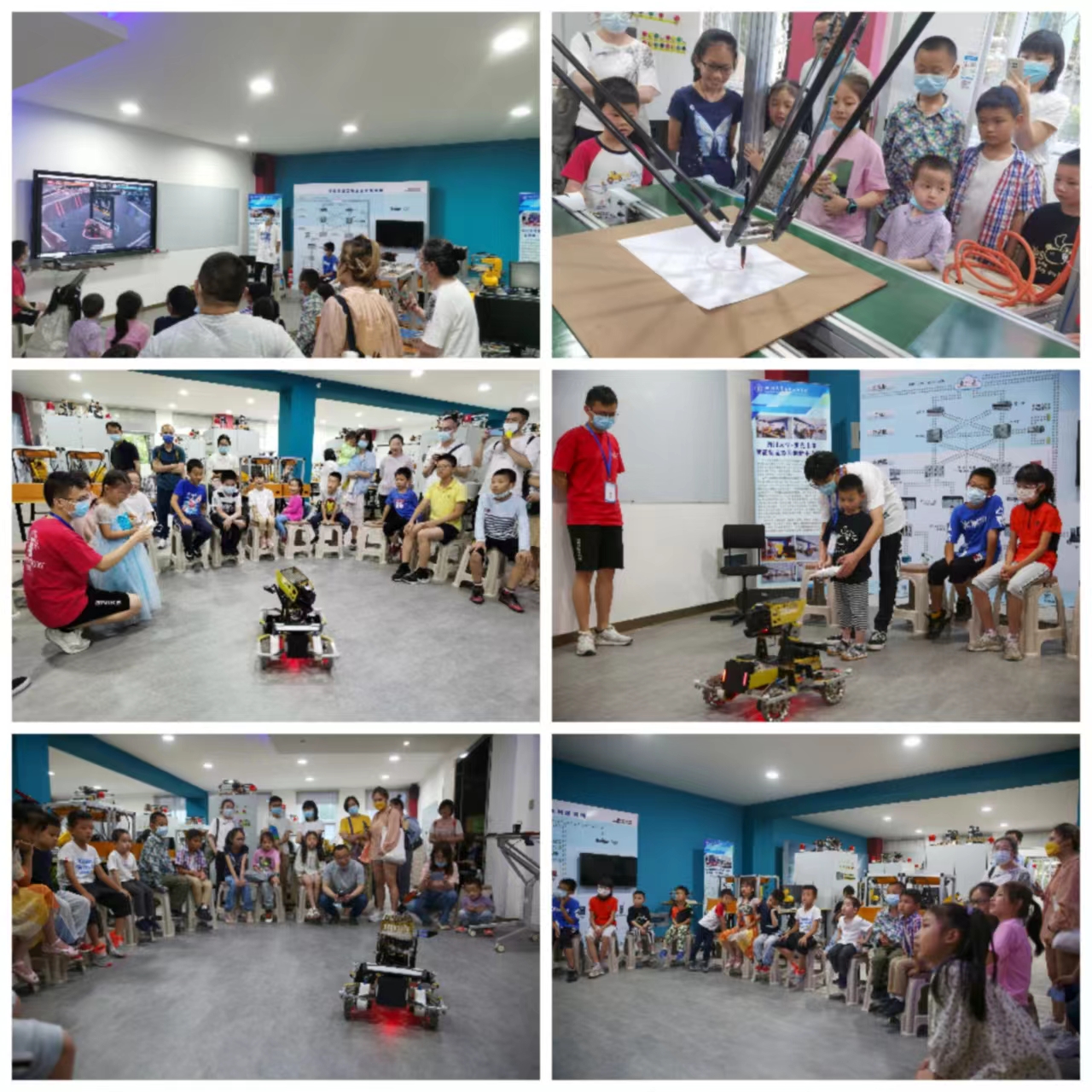 活动分为三个环节,分别是人工智能机器狗表演及操控体验、“乐动机甲”—“全国大学生机甲对抗大赛”视频讲解、战斗机器人动作演示和操控体验和三臂机器人绘画表演。