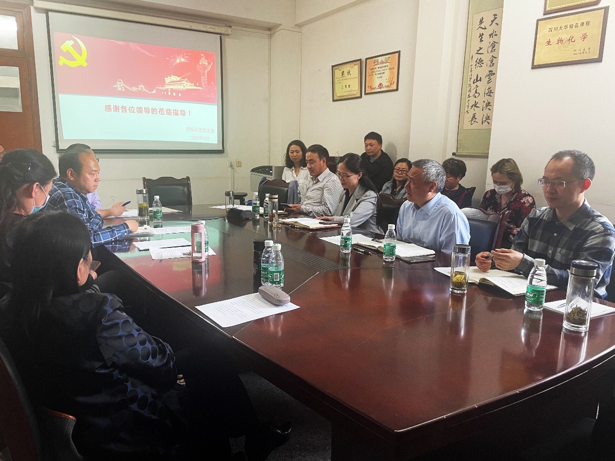 4月8日下午,学院党委书记李华、院长李昌龙、副书记陈维操、副院长刘肖珩、梁伟波、张舒羽,工会主席黄莉及机关各部门负责人一行10人到逸夫基础医学楼三楼生物化学与分子生物学教研室会议室开展调研,生医生化党支部及相关二级单位共计21名教职工参会,会议由生医生化党支部书记沈阳主持。
