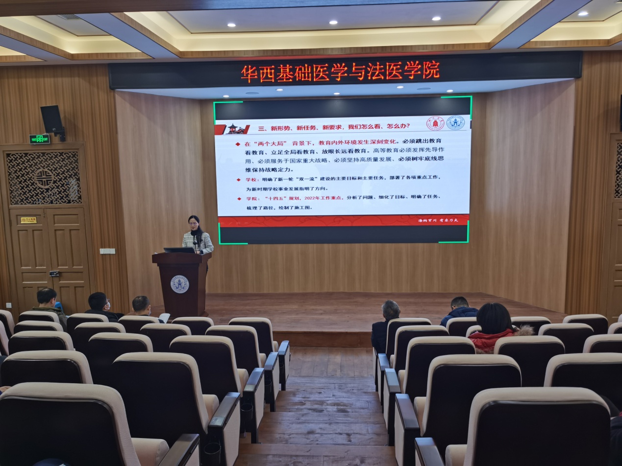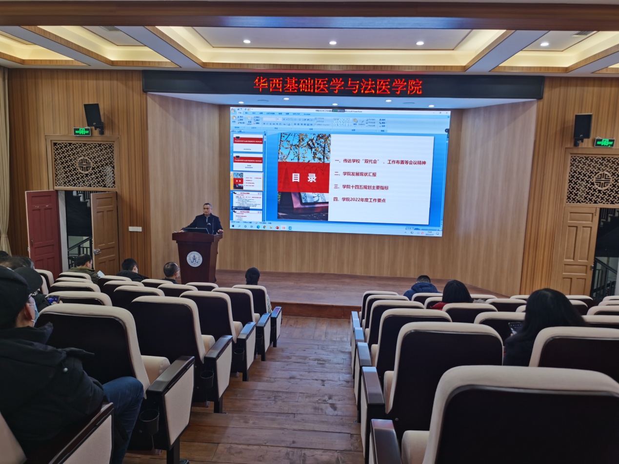 2月25日下午,我院2022年工作布置会在华西第五教学楼报告厅召开,会议采用线上、线下相结合的方式。学院领导、科级干部、党支部书记、教研室主任现场参会,其他教师通过视频线上参会,会议由学院党委书记李华主持。