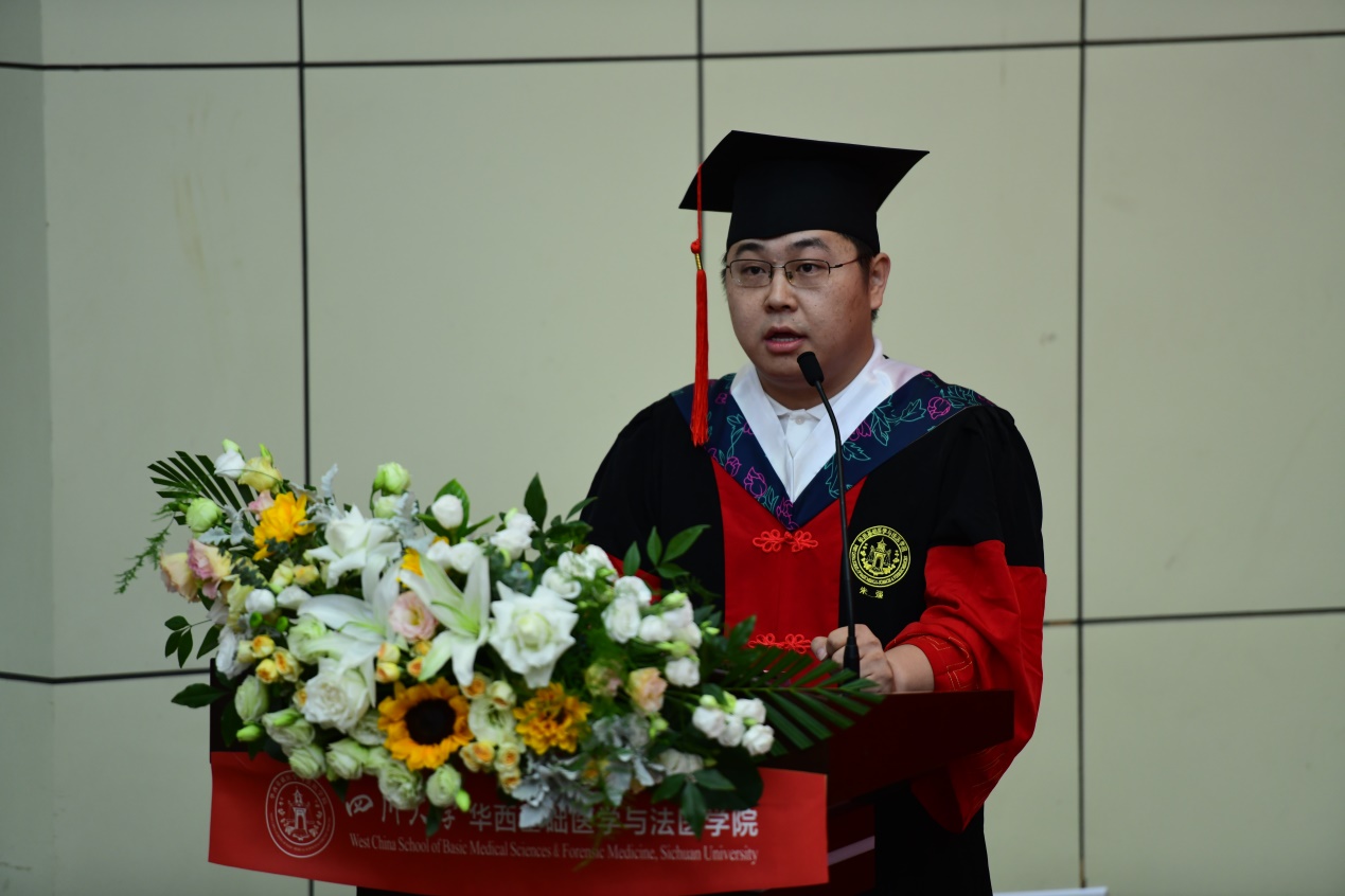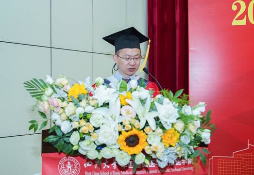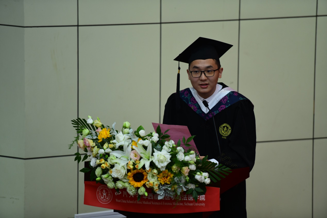 2018级基础医学专业沈诚忱同学和2020级法医学博士生朱强同学分别代表本科生、研究生发言,感谢学校和学院提供的学习环境和资源,感谢老师们的辛勤培育,感谢家长、同学们一路的支持和陪伴。他们分享了自己在校期间的收获与思考,希望同学们能在充满无限可能的未来中,披上百年华西的旷世风范战袍,以奋斗之青春担负起强国建设的重任,实现自己的人生价值,祝愿母校蓬勃发展、再书华章。