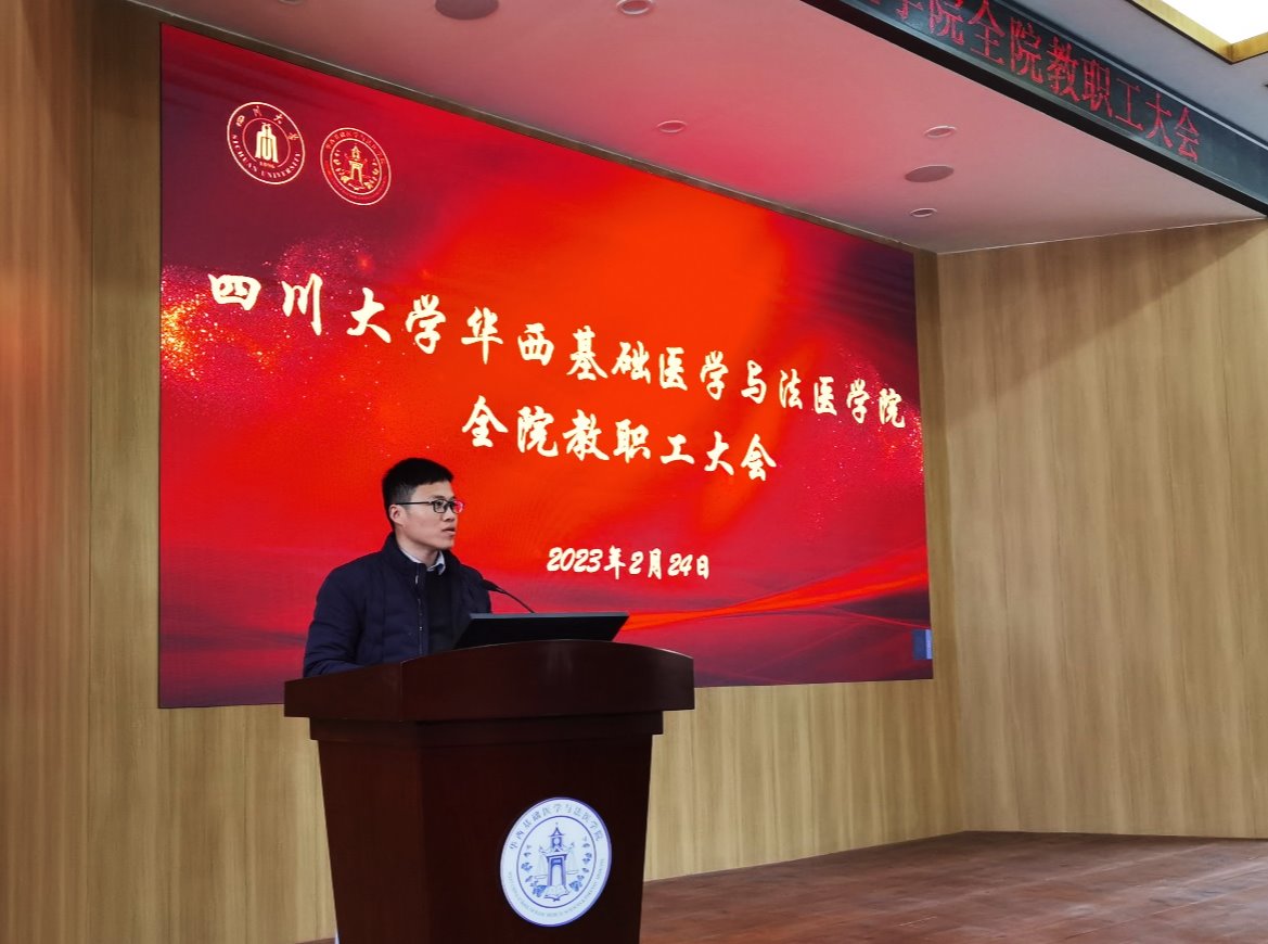 2月24日下午,学院教职工大会在华西校区第五教学楼报告厅成功召开。学院党政领导班子全体成员及全体教职工参会,学校党校办公室主任吴先国同志到会指导,会议由学院党委副书记陈维操同志主持。