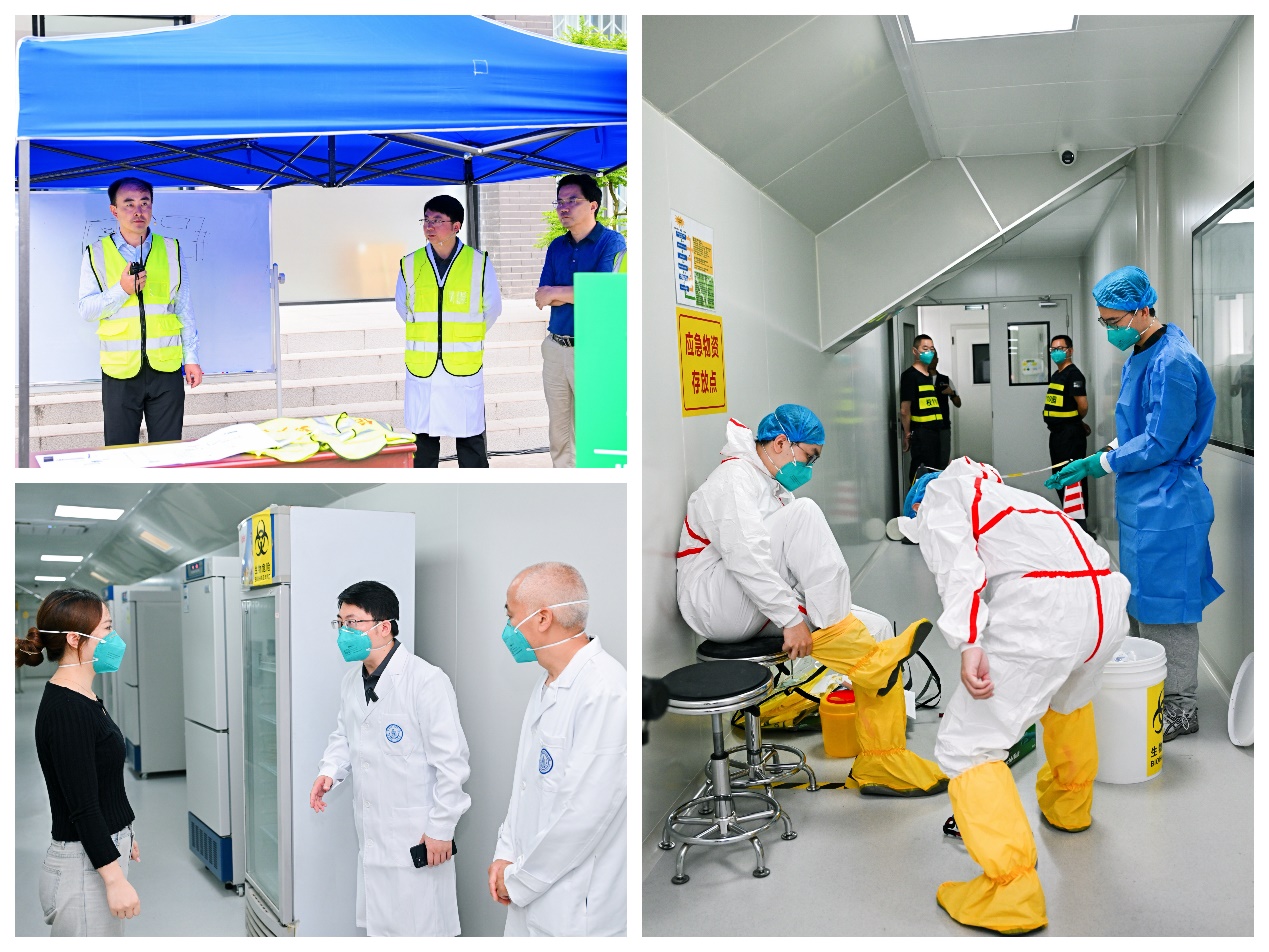 本次演练以病原微生物实验室安全为主题,我院作为承办单位,积极参与演练的策划与执行。学院领导小组组织协调,病原微生物学系老师倾力投入,近三个月里数十次优化演练方案,用精深的专业知识和丰富的实践经验为演练的成功举办提供了强有力的支撑。演练按照实验人员自救互救、事故上报、有序撤离、现场封锁、应急指挥中心组建、危害评估、应急队成员个人防护、现场处置、危险源消除、现场恢复、事故调查等应急处置流程开展,各环节安排紧凑,有序完成。演练承办工作得到了相关领导和专家的高度评价,在现场和线上观摩学习的师生获益匪浅。