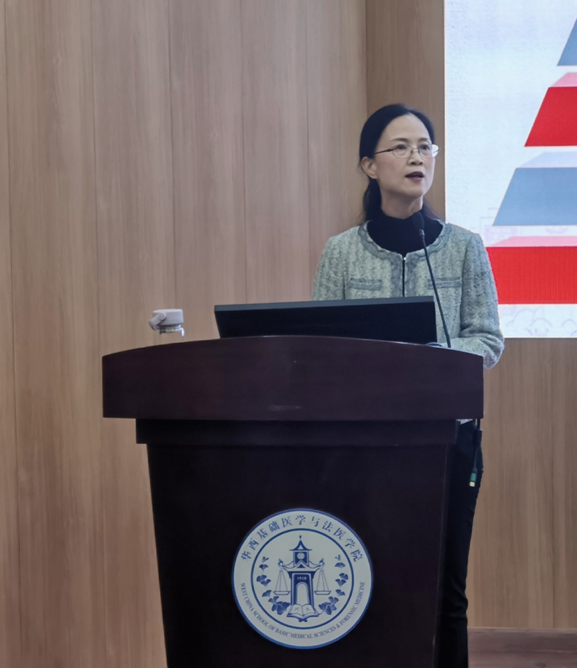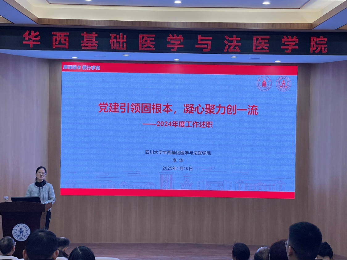 会上,学院党委书记李华同志作了题为《党建引领固根本 凝心聚力创一流》的工作述职报告,全面总结了学院2024年度党建融合事业发展的成效和特色亮点工作。她指出,2024年在学校党委的领导下,学院领导班子带领全院师生深入学习贯彻党的二十届三中全会和全国教育大会精神,贯彻落实学校党委九届三次、四次全会精神,扎实开展党纪学习教育,通过抓理论引领、抓贯彻落实、抓从严治党、抓“三个一流”、抓关键核心、抓群团统战六个方面,推动党建与事业深度融合高质量发展成效显著。并在教学育人、医工融合、科技科普三个方面发力,凸显了特色亮点。同时也强调了学院对标一流寻找差距,从四个方面细化制定了16项举措,下一步将为建设基础医学“双一流”学科、法医学高峰学科,加快推动华西医学整体迈入世界一流持续发力。