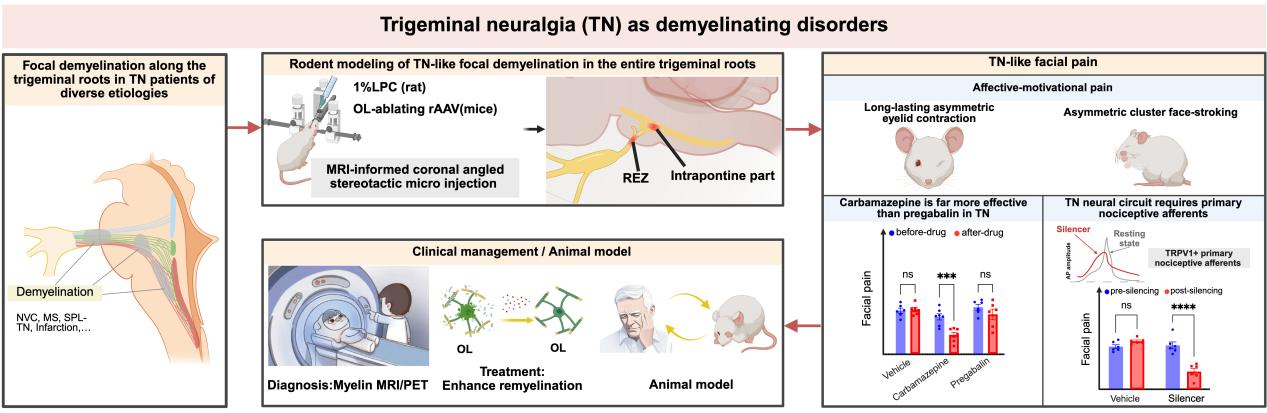 三叉神经痛被称为“天下第一痛”,患者常因轻微触碰面部而突发刀割样剧痛,严重影响患者的生活质量。目前,三叉神经痛诊疗指南聚焦于多样且未定的病因,并没有为三叉神经痛患者的实际诊治带来显著改善。值得注意的是,不同病因(如神经血管压迫、多发性硬化、脑缺血等)的三叉神经痛患者中均出现沿着三叉神经根全段走行分布的局灶性脱髓鞘病变。学界据此长期“想当然”地认为,三叉神经根脱髓鞘是三叉神经痛发病的核心病理机制。然而,这一临床推测始终缺乏直接证据—三叉神经根脱髓鞘本身能否独立引发三叉神经痛?这一关键问题的长期悬而未决,严重阻碍了从病理角度探究三叉神经痛的诊治。