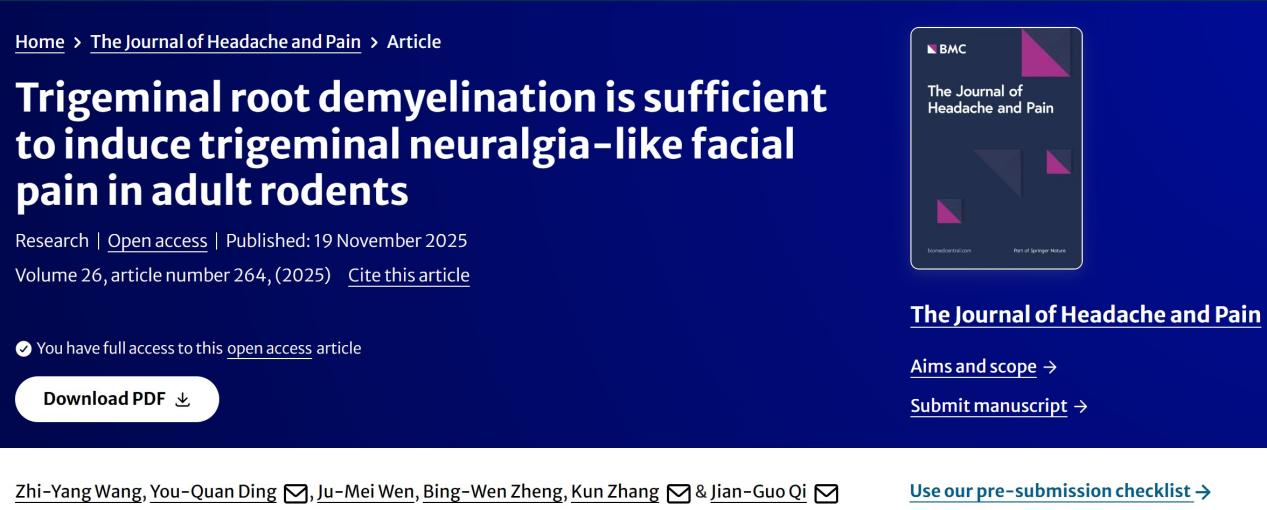 2025年11月19日,我院齐建国教授团队在Springer Nature旗下Journal of Headache and Pain(欧洲头痛联盟、亚洲头痛区域联盟和WHO全球抗头痛运动组织的会刊,中科院一区)发表了题为“Trigeminal root demyelination is sufficient to induce trigeminal neuralgia-like facial pain in adult rodents”的研究论文,解析了三叉神经痛核心病理特征“三叉神经根脱髓鞘”在三叉神经痛发病中的关键作用。英国威廉集团官网作为论文的唯一归属单位。