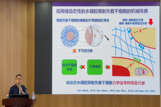 报告中,边教授详细解释了动态交联水凝胶对细胞行为的影响机制。他们的研究表明,具有较大解离速率常数的动态交联水凝胶能够实现快速的细胞力诱导的网络重组,从而促进干细胞的星状铺展、组装、机械传感和分化。此外,他还强调了细胞粘附配体与水凝胶动态网络的精确结合对于细胞力介导的网络重组和细胞的机械感应依赖性分化的重要性。