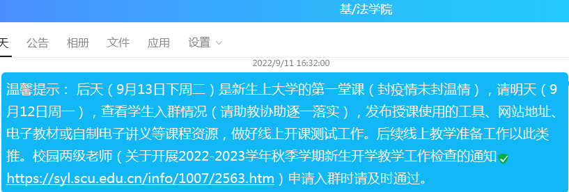 2022年秋新生开学际,泸定发生6.8级地震,疫情再次侵袭,2022级新生有的还未来到他们梦寐以求的大学,就要开启大学的学习生涯。上课第一周恰遇中秋节、教师节,在这非常时期学校和学院高度重视“疫情”下新生第一周线上教学工作,专门发文(关于开展2022-2023学年秋季学期新生开学教学工作检查的通知),学院按照教育部、学校对疫情下开展教学工作的部署与要求,全面开启线上教学。