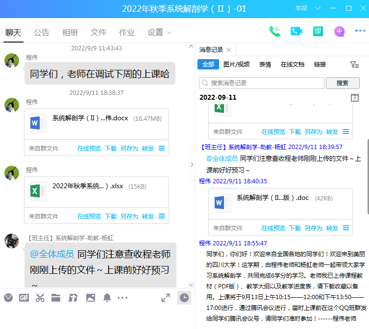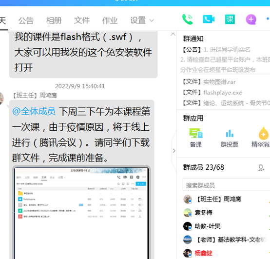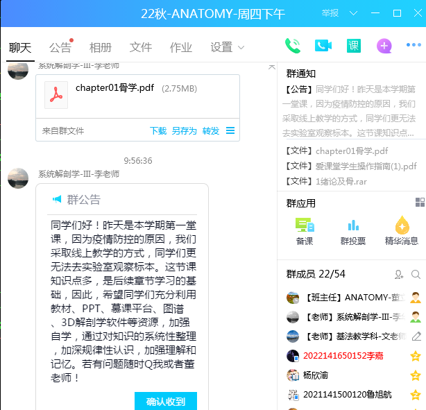 怎样才能让新生上好大学的第一堂课,学院领导和老师都在思考着,行动着。学院要求教师以教师使命,勇于担当,甘于奉献精神,在中秋节、教师节假期为上好第一堂,不拉下一个同学,做好开学前准备工作。辅导员、教学管理人员、任课老师通过多种通知途径让四面八方的新生聚集到QQ群,给同学们介绍医学课程学习的特点,方法,课程安排等,在授课教师的指引下,及时准备并熟悉授课软件和授课平台,下载电子教材或自制电子讲义、课程简介、课程进度安排、课程考核方案、线上资源共享课程的注册与使用等,耐心及时解答同学们的提问,为刚刚开启大学学习的学子们能上好第一堂课作好充分心理和学习准备付出了自己的心血。