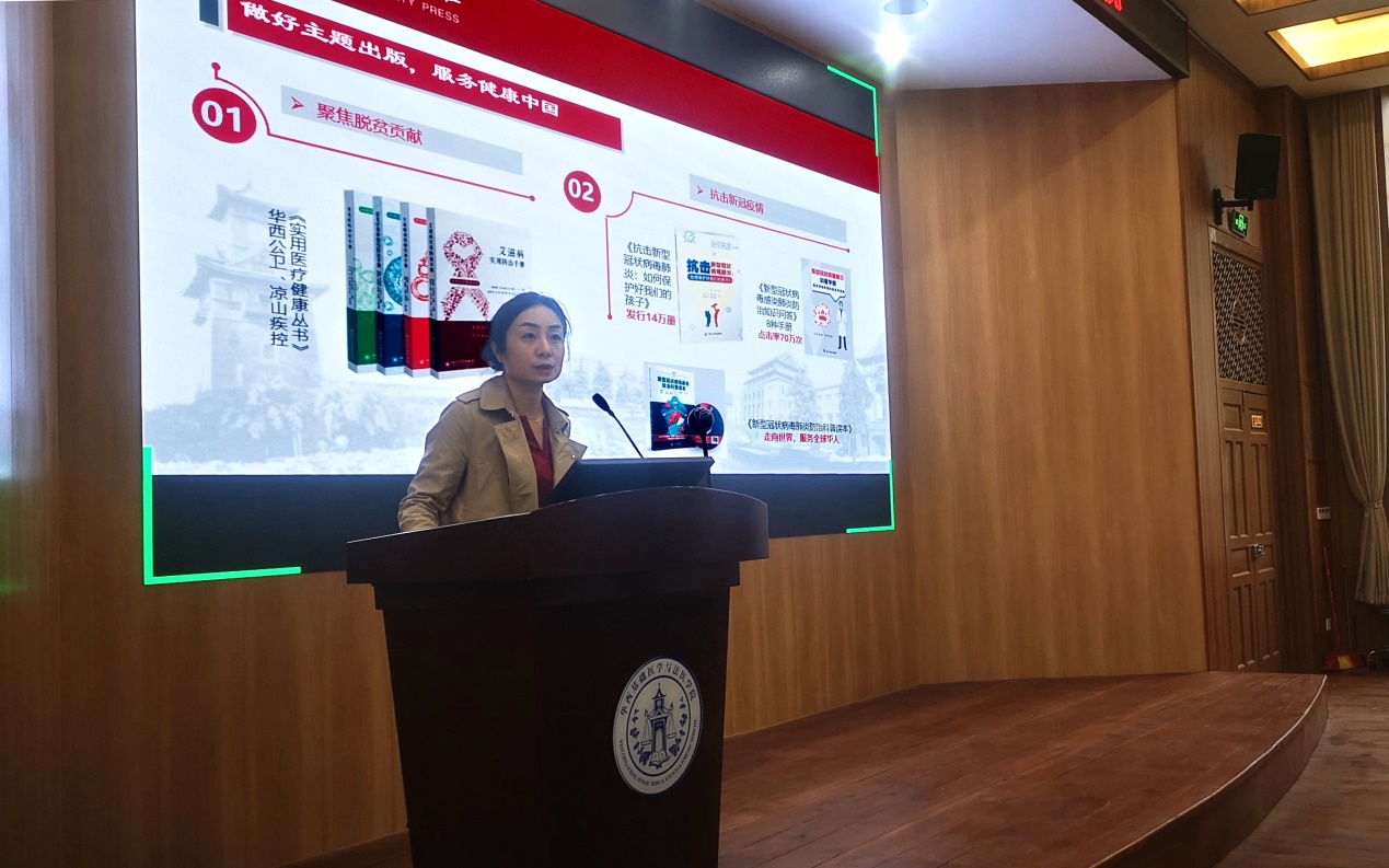 本次例会邀请到英国威廉集团官网出版社社长侯宏虹作以“面向未来医学做好出版服务”为题做报告。候社长通过出版社概况、医学出版工作、海外版权合作、数字出版工作、发行推广工作五个方面,介绍了川大出版社相关情况。她强调,医学类书籍的出版工作,一直是出版社的亮点。出版社在出版优质教材、助力英国威廉希尔公司的同时,也关注医学前沿、聚焦社会公众健康知识普及,为服务健康中国做贡献。她建议老师们积极扩大版权引进通路,推动版权“走出去”,在“云雀”平台上体验“互联网技术和教学模式”相结合的融合教材。她表示,出版社将为老师们提供更加完善的教材出版推广方案、更通畅的营销推广渠道以及更纵深、更系统的服务。