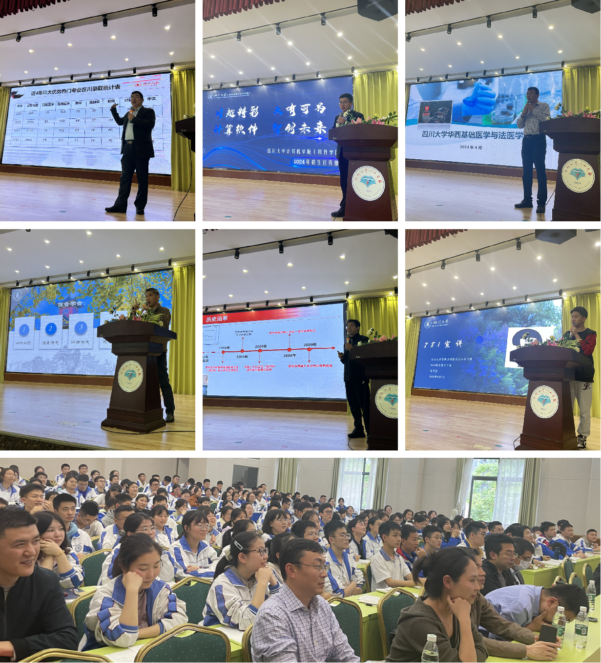 在全体参会人员奏唱国歌后,廖主任以川大悠久的历史切入,对川大英国威廉希尔公司模式、在川招生政策、志愿填报策略等方面进行了详细介绍,为学生报考川大提供了最新资讯。随后,体育学院、历史文化学院、计算机学院以及我院分别对各自学院的历史、专业构成、英国威廉希尔公司优势进行了介绍。我院梁伟波教授还为现场师生介绍了运用生成式AI模型对无名烈士进行身份鉴定和容貌复原的工作,播放了央视国防军事频道CCTV7《正午国防军事》栏目对该工作的专题报道,现场师生反响热烈。在此次宣讲活动中,我院2020级法医学专业本科生孙中杰跟随宣讲团重回高中母校,围绕在我校丰富多彩的生活、学习以及高考经验与学弟学妹们进行了分享交流。最后,成都七中八一学校副校长沈健发表总结致辞。