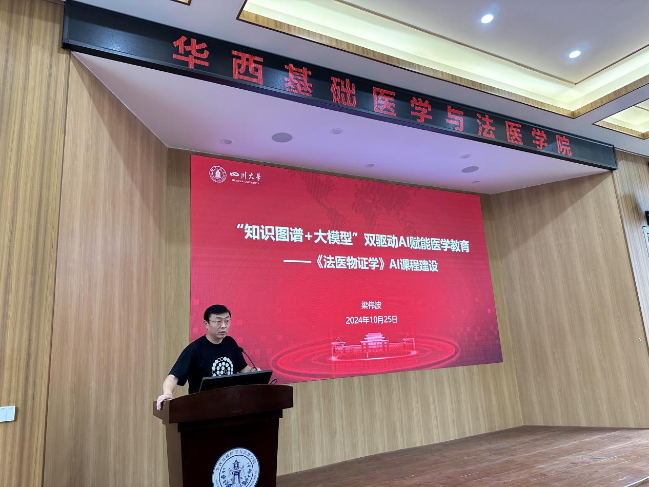 最后由法医物证教研室梁伟波教授分享“知识图谱+大模型”双驱动AI赋能医学教育—《法医物证学》AI课程建设。他强调,在医学教育过程中,未经过专业训练的大语言模型往往回答较为宽泛,缺乏一定的精准性。因此,法医物证课程组致力于开发具备专业知识点链接的大语言模型,由师生通过日常的教学活动不断对大语言模型进行训练,提炼专业知识点之间的逻辑关系,以此来实现医学教育的知识图谱课程建设目标。