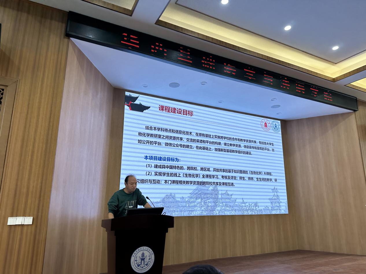 随后,由基于知识图谱的AI课程建设重点项目负责人分别就课程建设工作的进展进行分享。生物化学教研室的刘戟教授从课程建设的前期基础、阶段性成果以及存在的问题和改进措施三个方面详细地介绍了《生物化学》课程群组的建设情况。他表示,项目组明确AI课程建设目标,积极推进本学科和信息化技术的结合,努力实现建成具有中国特色的、跨院校、跨区域、开放共享的基于知识图谱的《生物化学》AI课程。