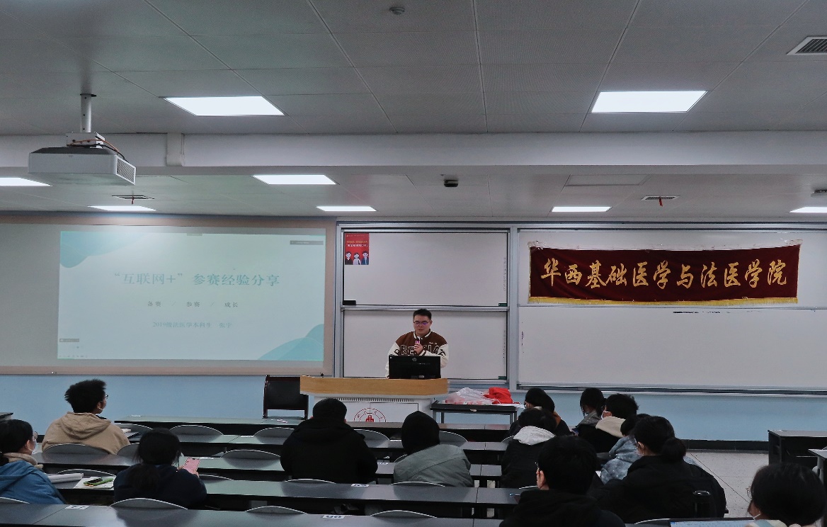 随后,2019级法医学张仕豪同学作为第八届“互联网+”国银团队的负责人,以“互赛小白的打怪升级之路”为题,为大家介绍了自己参加“互联网+”创新创业大赛的经验。他表示,通过此次比赛不仅积累了经验,全面提升自身创新创业、团队协作等能力,更重要的是找到了自身价值,拥有了重新定义自己、衡量自我的机会。他希望大家积极准备,踊跃参赛,挑战自我。