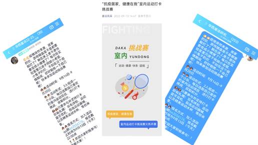 在为期7天的活动中,参与活动的同学们“各显神通”,每天都完成不同的运动项目,不仅严格按照防疫要求居家隔离,还坚持运动打卡,积极响应“抗疫居家,健康在我”的活动口号。本次活动吸引了不同专业、不同年级、不同学历阶段的同学参与,通过规律健康的运动焕发出青春的活力,为抗疫生活增添了光彩。活动中大家采用健身操、瑜伽、哑铃、跑步机锻炼等多种室内运动形式提升自己的身体素质,每次运动结束后精心记录或剪辑的照片、视频则展现了坚持抗疫、健康生活的乐观心态,也将那一份从容传递给每一位积极抗疫的同伴。