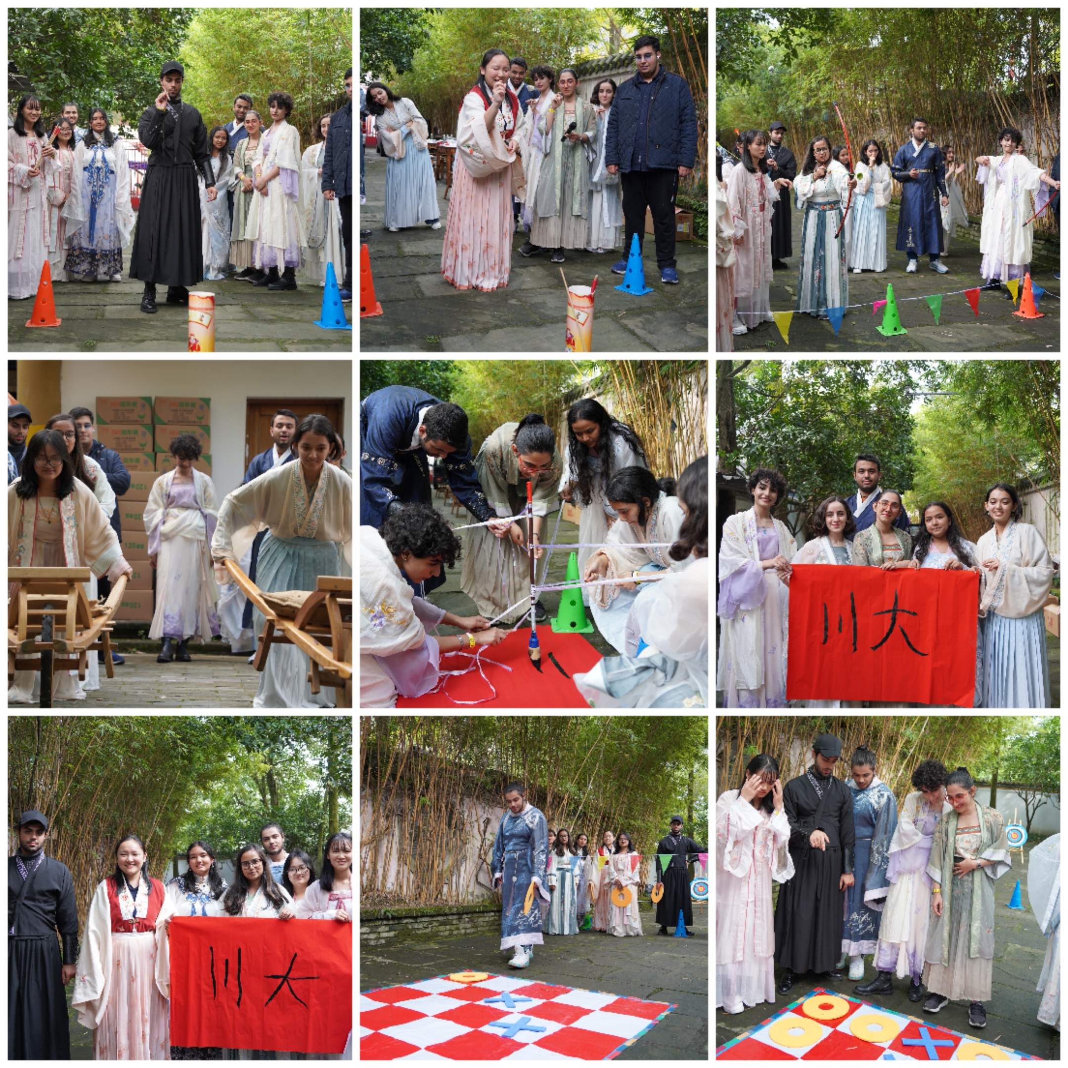 除了川剧体验,射箭、投壶等传统体育项目也让留学生们大呼过瘾。他们纷纷拿起箭矢,瞄准靶心,体验古代武士的英勇与豪迈;在投壶游戏中,他们则展现了极高的手眼协调能力和耐心。此外,鸡公车体验让留学生们感受到了巴蜀农耕文化的独特魅力。他们推着鸡公车来回穿梭,亲身体验了巴蜀人民的勤劳与智慧。在“神笔马良”活动中,留学生们齐心协力,顺利地用“神笔”写下“川大”两个字,让留学生在充满趣味的游戏中感悟中华书法汉字之美,体会团结合作的力量。在紧张刺激的“五子棋”比赛环节,随着棋子交替落下,留学生们深入了解了五子棋文化中的中国智慧。