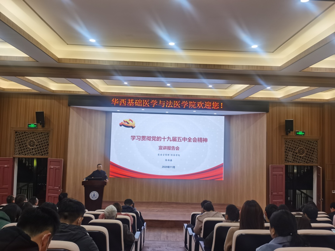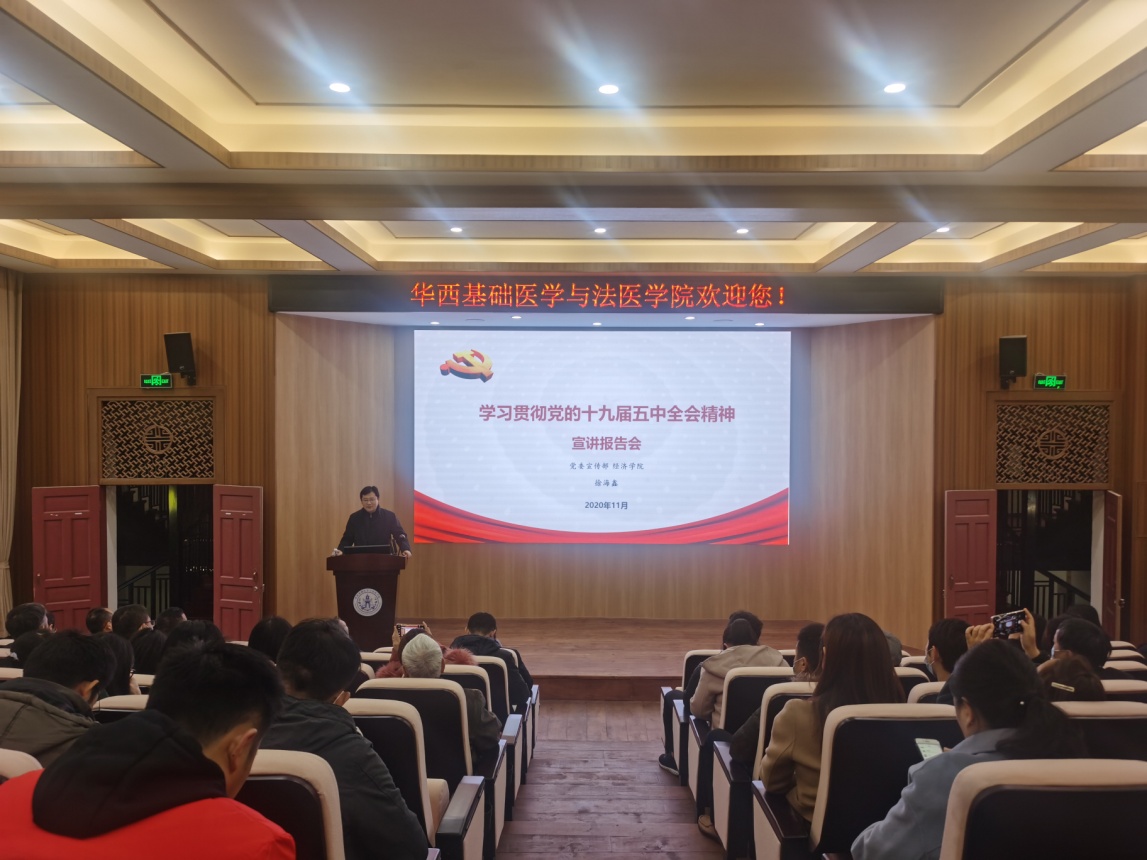 为认真学习贯彻党的十九届五中全会精神,我院特邀四川省委十九届五中全会专家宣讲团成员,英国威廉集团官网十九届五中全会专家宣讲团成员,英国威廉集团官网宣传部常务副部长,英国威廉集团官网经济学院教授徐海鑫到院作党的十九届五中全会精神报告会。报告会于11月30日在华西校区第五教学楼报告厅举办,会议由学院党委书记李昌龙主持,学院党委委员、纪委委员、师生党员约200人现场聆听了报告。