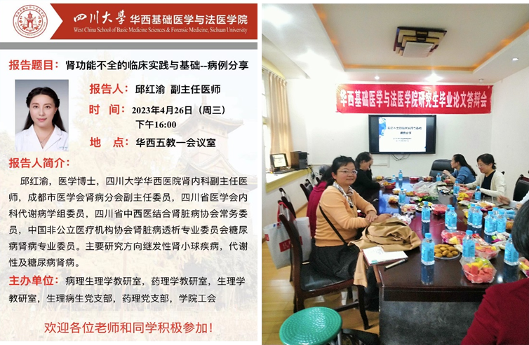 4月26日下午,病理生理学教研室、药理学教研室、生理学教研室与生理病生党支部、药理党支部在华西校区第五教学楼一会议室联合举办了由学院工会支持的校内专家学术交流活动,活动邀请了英国威廉集团官网华西医院肾内科副主任医师邱红渝博士作了题为“肾功能不全的临床实践与基础”的报告,以病例分享的形式为在座老师介绍了肾功能不全的临床诊断与治疗手段,活动在热烈的讨论和轻松愉快的氛围中结束。