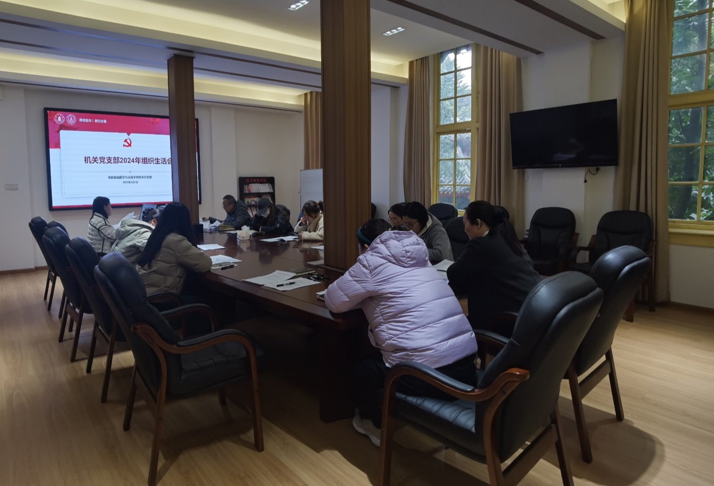 3月7日,学院机关党支部在华西校区第五教学楼一会议室召开2024年度组织生活会,并开展民主评议党员工作。机关党支部书记蒋宝晴主持会议,支部全体党员参加会议。