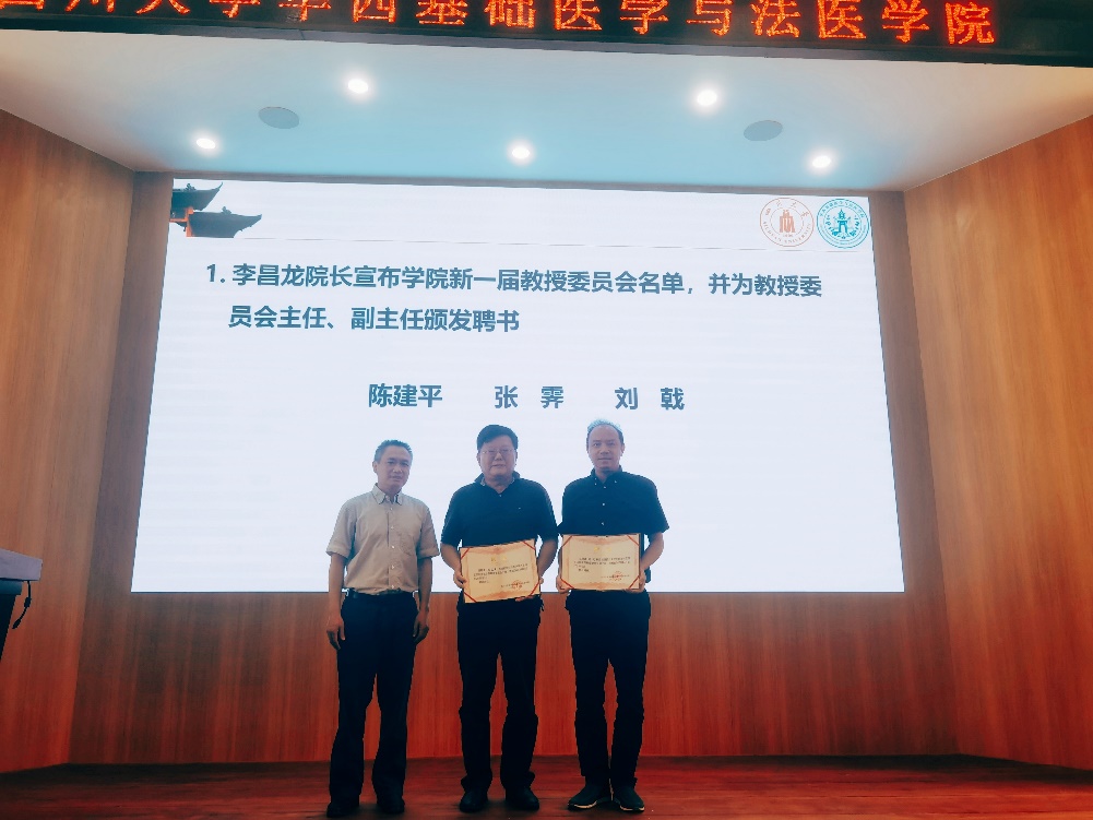 6月24日,全院教职工大会暨新一届教授委员会委员聘任仪式在华西第五教学楼报告厅隆重举行,会议由学院党委书记李华教授主持。李昌龙院长宣读学院新一届教授委员会名单,并为教授委员会主任、副主任委员颁发聘书。19名教授获聘学院新一届教授委员会委员。