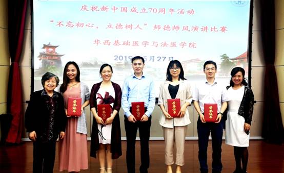 来自学院各单位14位老师参加了比赛,他们结合教书育人的工作实践以及成长过程中优秀教师的感人事迹,用抑扬顿挫、声情并茂的演讲,诠释了对师德师风的理解。经过近一个半小时的精彩演讲和5位专家的现场评分,病原生物学系李浇老师歌颂伟大人民教师黄大年教授的《上善若水,大爱无痕》获得了一等奖;生理学教研室周华老师的《我们的岗位》等3个作品获得二等奖;人体解剖学教研室冀珍妮老师的《铸美好师德,育优良师魂》等5个作品获得三等奖;生理学教研室朱敏佳老师的《学高为师,德高为范》等5个作品获得优秀奖。