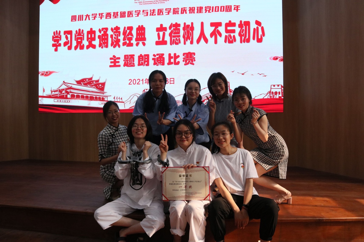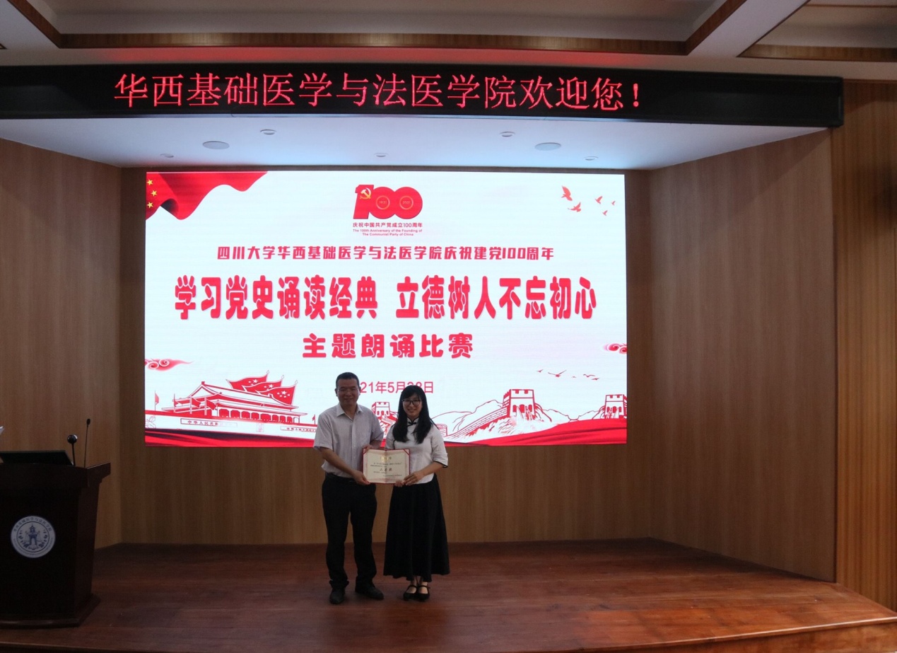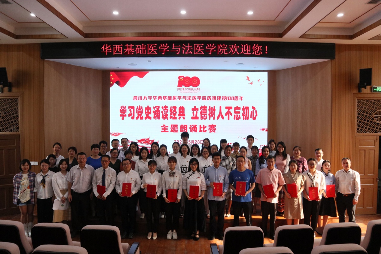 紧接着郭晓伟副书记为本次比赛进行了总结,高度肯定了大家的精彩表现。经过近两小时的激烈角逐,通过评委现场评分,最终从13支队伍中分别评选出一等奖1个、二等奖2个、三等奖3个、优秀奖7个。2019级硕士党支部不负众望,以高分夺得本次比赛的一等奖;感染免疫支部、法医博士党支部荣获二等奖;2020级硕士党支部、2017、2018级本科江安联合党支部、生医生化支部获得三等奖,其余参赛队伍获得优秀奖。学院领导为获奖队伍授予了荣誉证书。本次“学习党史诵读经典立德树人不忘初心”朗诵比赛在全体成员的合照留念后圆满结束。