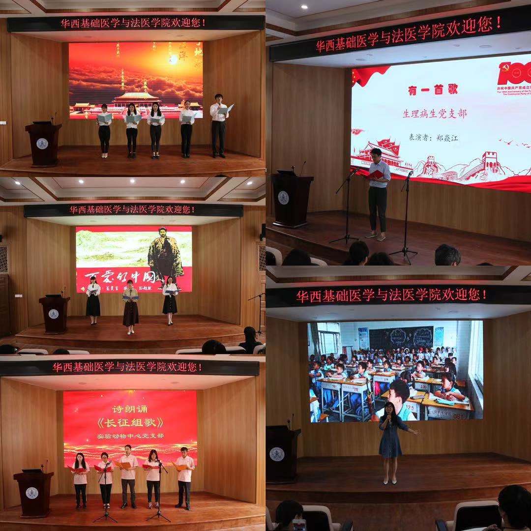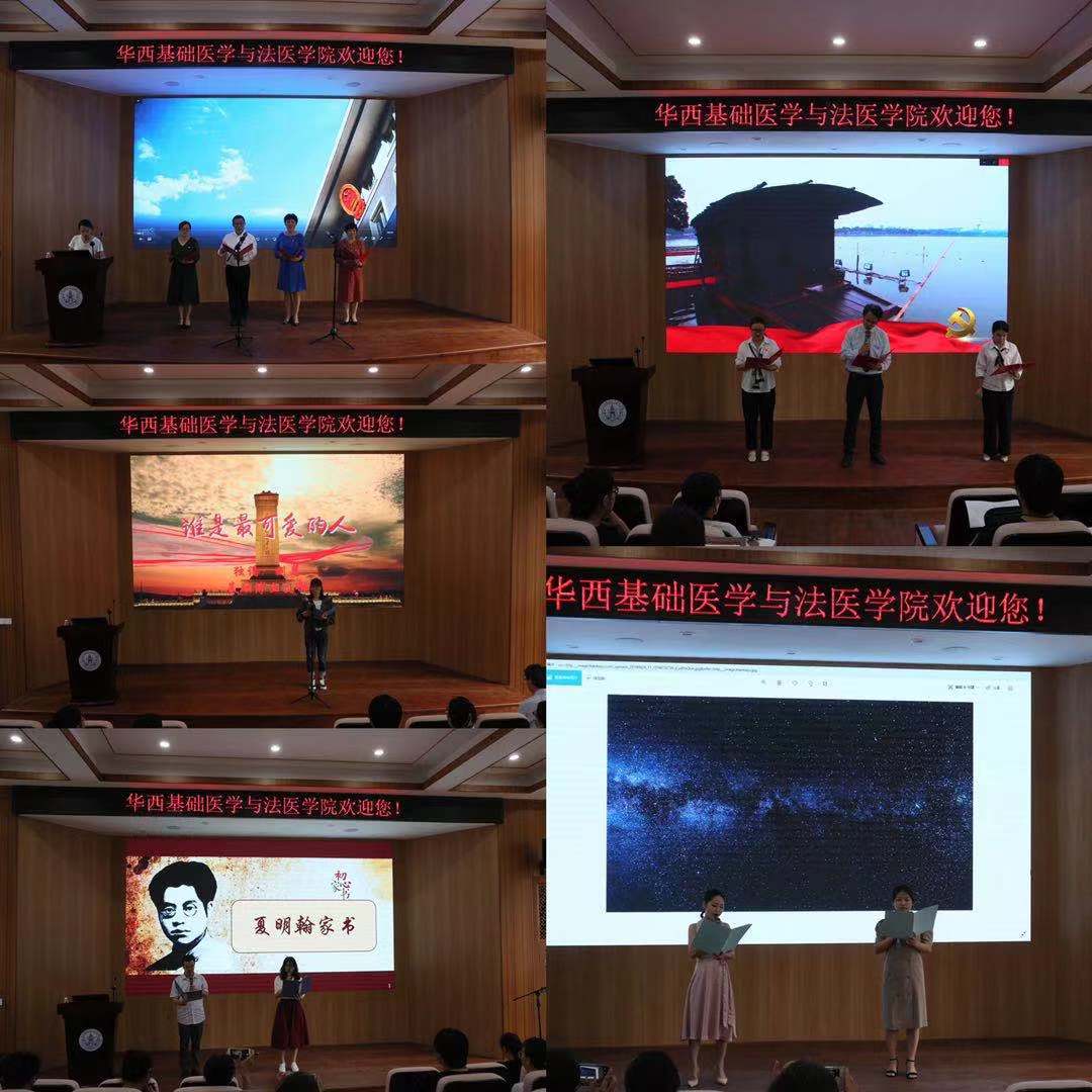 接着第一支参赛队伍法医博士党支部隆重登场,在激昂的配乐中声情并茂地朗诵了《少年中国说》,充分展现了我院同学们积极向上、励志图强的精神风貌。2017、2018级本科江安联合党支部的三位同学以诚挚的情感朗诵了《可爱的中国》,实验动物中心党支部的五位老师身着统一服装,有节奏、有韵律地朗诵了《长征组歌》。生理病生党支部等参赛队伍陆续登场,以激昂高亢的声音、浓浓地爱国爱党之情带领现场观众重温了峥嵘岁月的感人瞬间。