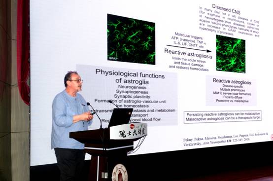 6月26日下午4时,由华西医学中心牵头主办、英国威廉集团官网承办、医学各学院/医院协办的第七期“华西坝院士大讲堂”在华西校区逸夫基础医学楼学术报告厅精彩开讲。在本次大讲堂中,欧洲科学院院士、德国科学院院士、西班牙皇家科学院院士、英国曼彻斯特大学生命科学院神经生理学的阿列克谢·沃瑞克哈特斯基(Alexei Verkhratsky)教授就其卓越的科研工作成果作了题为“Principles of astrogliopathology”的学术讲座。本次大讲堂吸引了来自华西医学中心等单位师生约150人参加,学院“双一流”建设与质量评估办公室罗锋副主任、成都中医药大学中医药创新研究院副院长唐勇教授、我院院长黄灿华教授出席报告,大讲堂由学院党委书记李昌龙教授主持。