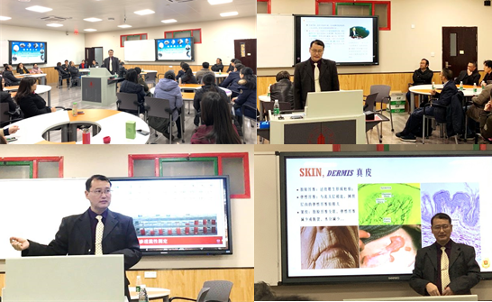 讲座分为三个部分。董教授首先从历史角度分析我国教育缺乏创新力的培养,结合新时代本科教育的理念提出:新时代医学教育中最大的思政教育即是“服务人民健康”,要注重教师教学能力和综合素养的提升,用新理念、新手段打造新时代的“金课”。然后董教授作了“基于混合式教+学理念,打造专业课与思政教育相结合的金课”的现场示范课讲授,董教授以《皮肤组织学》章节为例,课程充分展现出专业教育与思政教育、基础医学与临床医学、医学教育与人文教育、教学与科研引导等方面的融合,也很好地调动了在场师生的学习热情和主动性,达到了教师引导、培养学生为主的教学效果;董教授以自身经历为例鼓励教师们加大对教学的投入,立德树人、天道酬勤。示范课后,董教授与在场师生分享了基础医学实验教学改革中的心得体会,将科研思维融入实验教学。在场师生就本科教学中遇到的问题与董教授展开了深入的交流探讨。