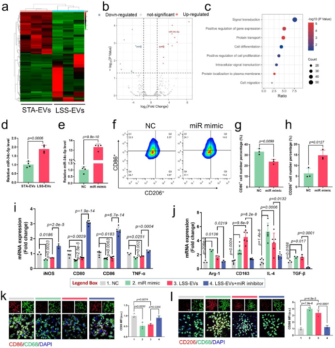 图2. LSS-EVs 在体外通过miR-34c-5p诱导M1型巨噬细胞表型转化