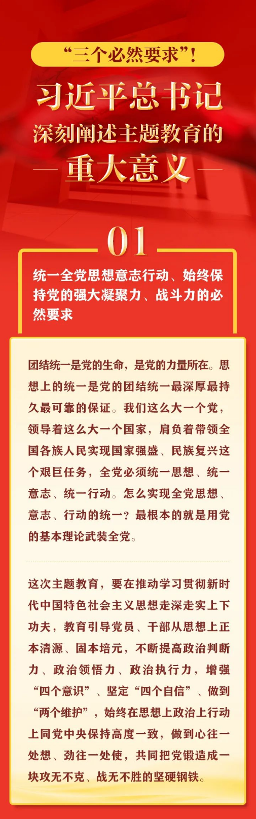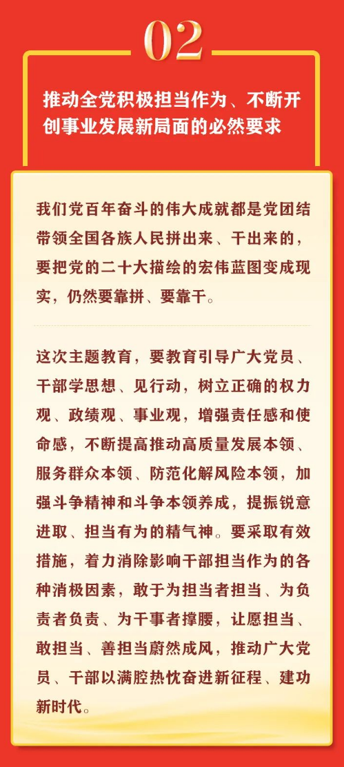 “以县处级以上领导干部为重点在全党深入开展学习贯彻新时代中国特色社会主义思想主题教育,是贯彻落实党的二十大精神的重大举措,对于统一全党思想、解决党内存在的突出问题、始终保持党同人民群众血肉联系、推动党和国家事业发展,具有重要意义。”