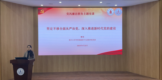 学院党委书记李华传达了学校2023年全面从严治党工作要求,对学院2023年全面从严治党重点工作进行安排部署,并以《坚定不移全面从严治党,深入推进新时代党的建设》为题讲授了党风廉洁教育主题党课。党课深入结合党的二十大报告,聚焦党的政治建设、思想建设、组织建设、作风建设、纪律建设和制度建设,从全面从严治党的提出与发展、全面从严治党的科学内涵、全面从严治党的必要性、全面从严治党体系的特征与路径四个方面深刻阐述了“全面从严治党永远在路上”的重大意义,深入浅出地分析了如何推进全面从严治党向纵深发展。李华指出,学院全体师生将坚持以习近平新时代中国特色社会主义思想为指导,深入学习贯彻党的二十大关于全面从严治党战略部署和二十届中央纪委二次全会精神,落实落细落小学校全面从严治党的具体要求,做好学院2023年全面从严治党九项重点工作,推动学院党建与事业高质量深度融合发展,以新气象新作为推动学院高质量发展取得新成就。
