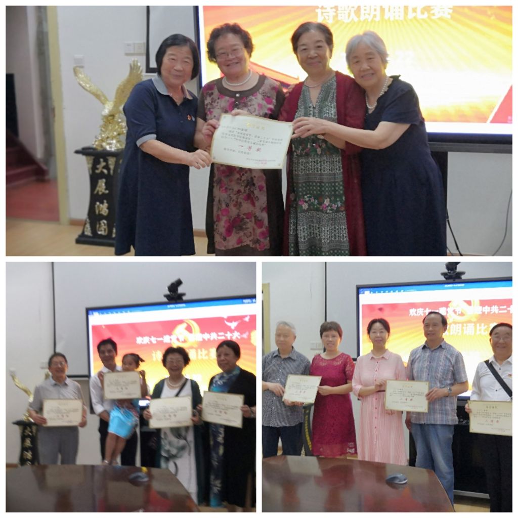 中华经典美文诵读比赛在退休党支部支委们带来的《你是伟大民族的荣光》的表演中拉开帷幕。八组共十四位离退休党员同志参加比赛。参赛老师朗诵时感情真挚,他们或慷慨激昂,或声情并茂的朗诵,从不同角度、不同方面,满怀深情地表达了对祖国母亲、对中国共产党的感激和热爱之情。通过现场评分,由曾志源、蔡美英、李光蓉、卿德华四位老师诵读的《党的赞歌》获得第一名。黄莉和一、二党支部书记李明远、张蓉为获得名次的老师们颁发了获奖证书。