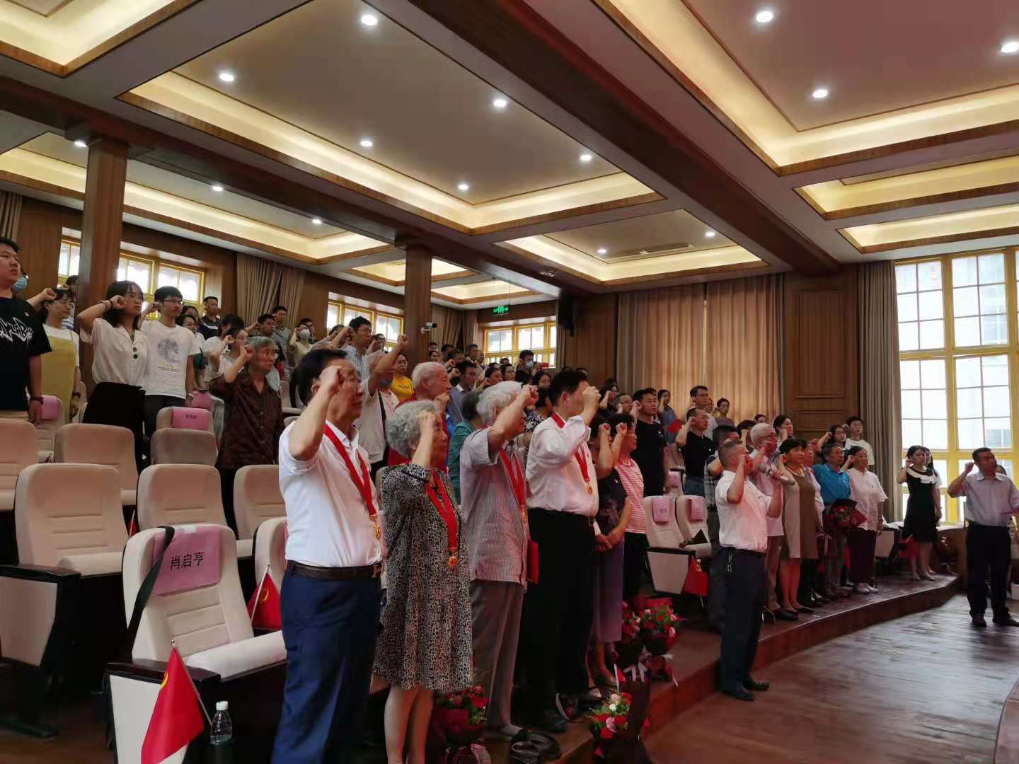 在党委书记李昌龙同志的带领下,全体党员同志重温了入党誓词。全场合唱《没有共产党就没有新中国》把大会的气氛推向了高潮,大家纷纷挥动手中的党旗,齐声歌颂。