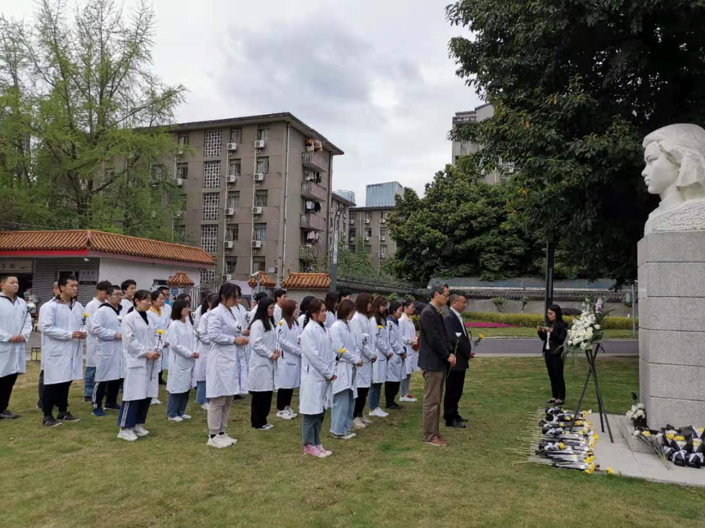 4月2日下午,学院党委副书记郭晓伟、全体辅导员老师以及学生代表齐聚毛英才烈士塑像前,缅怀革命先辈。在烈士塑像前,全体师生手捧菊花,肃立静默,向革命先烈默哀。学生代表宣读了毛英才烈士的英雄事迹,带领大家追忆以毛英才为代表的校友英烈为革命事业奉献青春的光荣岁月。全体师生逐一向毛英才烈士鞠躬,敬献鲜花,表达新时代医学生知党恩,跟党走,传承红色革命精神,争做又红又专时代新人的坚定信念。