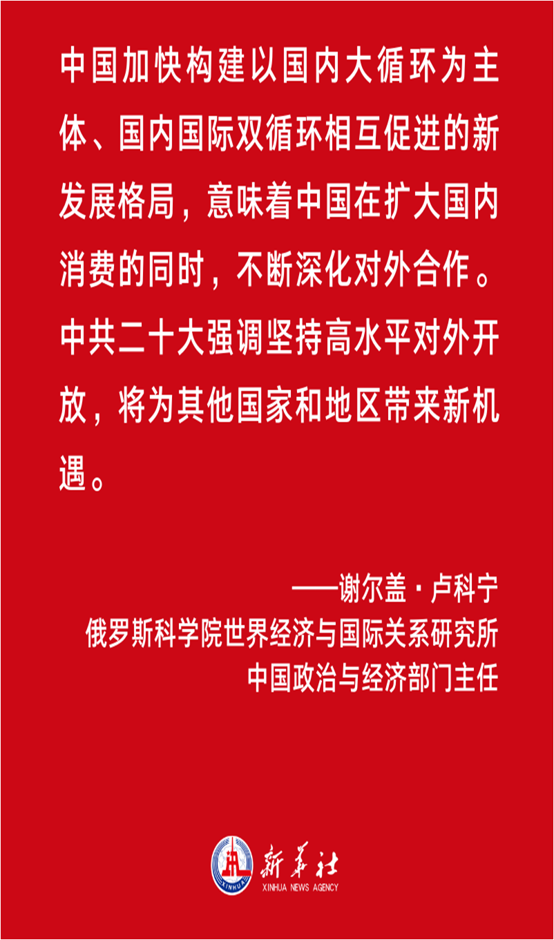 俄罗斯科学院世界经济与国际关系研究所中国政治与经济部门主任谢尔盖·卢科宁解读道,中国加快构建以国内大循环为主体、国内国际双循环相互促进的新发展格局,意味着中国在扩大国内消费的同时,不断深化对外合作。他认为,中共二十大强调坚持高水平对外开放,将为其他国家和地区带来新机遇。