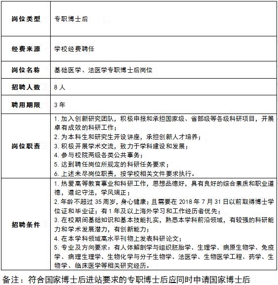 岗位类型专职博士后经费来源学校经费聘任岗位名称基础医学、法医学专职博士后岗位招聘人数3人聘用期限3年岗位职责1.承担教学科研任务,开展卓有成效的科研工作;2.进入既有创新平台,加入研究团队;3.承担创新英国威廉希尔公司;4.承担学科建设任务;5.承担公共事务工作。招聘条件1.遵纪守法,学风端正,身心健康,具有国内外高水平大学博士学位,原则上具有一年及以上海外学习和工作经历;2.年龄不超过35岁;3.具有独立开展科学研究能力,...