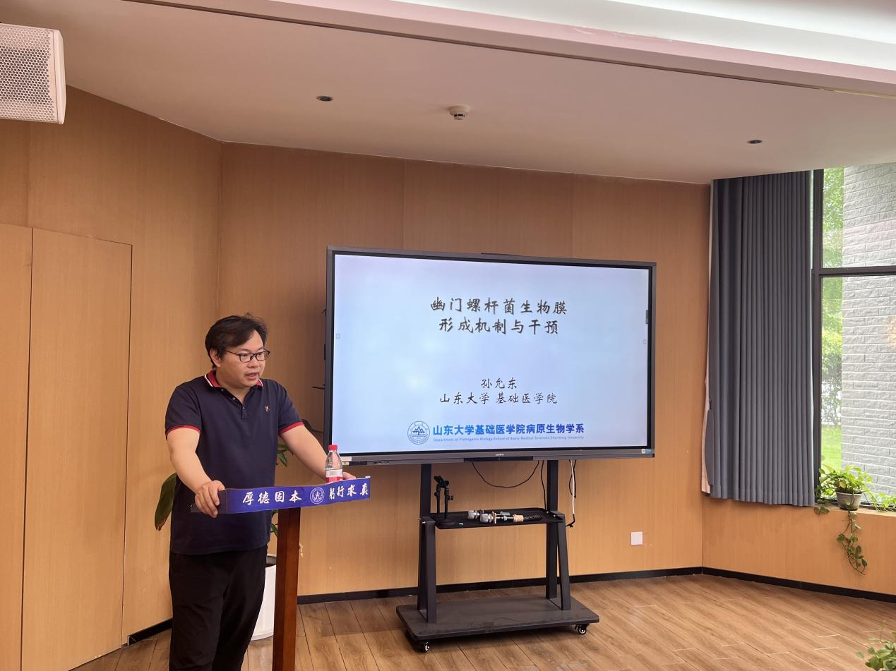 2025年5月16日,山东大学基础医学院病原微生物学系孙允东教授应邀到我院作学术报告并进行学术交流。孙允东教授长期从事医学幽门螺杆菌生物膜形成机制的微生物学研究,本次他以“幽门螺杆菌生物膜形成机制与干预”为题作学术报告。在报告中,孙教授介绍了团队近年来在幽门螺杆菌生物膜形成的机制相关研究成果:揭示了氧化应激诱导幽门螺杆菌生物膜形成机制,其中GluP、SpoT、NapA等基因在幽门螺杆菌生物膜的形成重具有关键作用,...